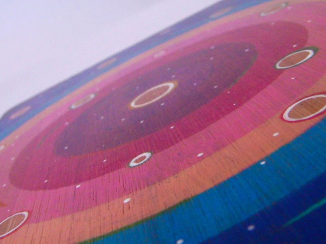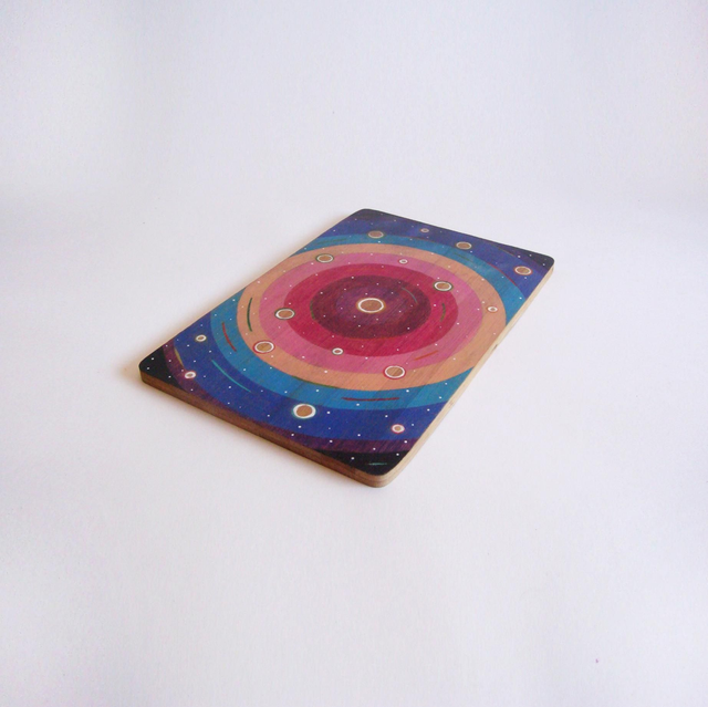 Hecho a mano sobre tabla de Bamboo, lápices de colores, pintura acrílica, aerosol de acabado brillante.